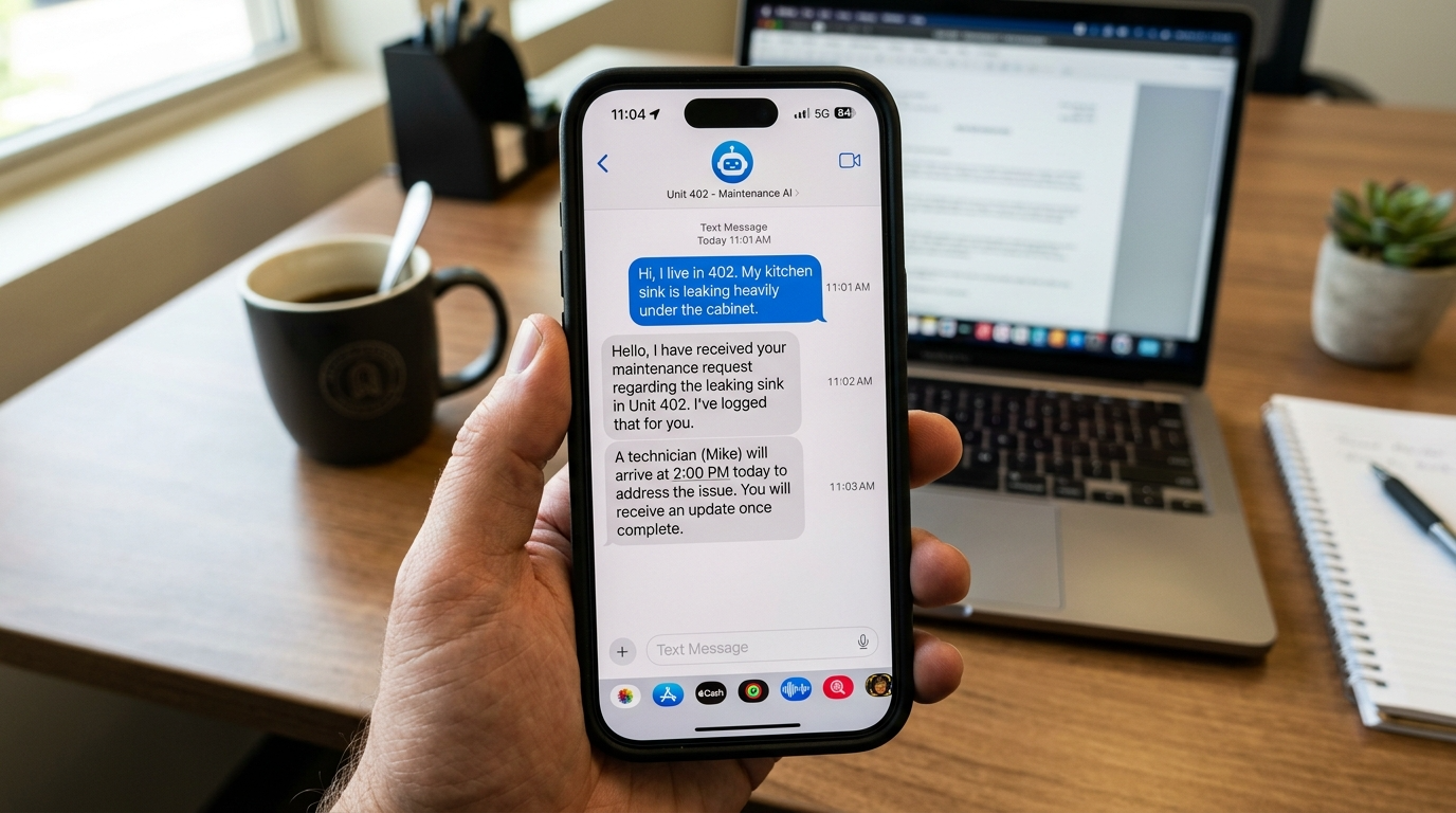 Maintenance Request Intake via Conversational AI: This involves using an AI powered agent to answer phone calls and text messages. A tenant can call at 2 AM with a leak and have a natural conversation with an AI that understands the problem, asks clarifying questions, and initiates the workflow instantly. AI can answer a call in under one second, while on call staff might reply by telephone to a page or call within 15 minutes while on-call.